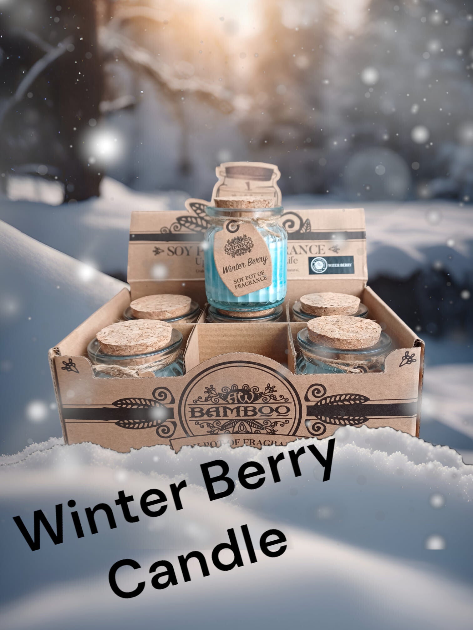 Winter Berry Mini Candle in a little jar with cork lid. Each candle comes with a natural label wrapped around the jar with twine.
