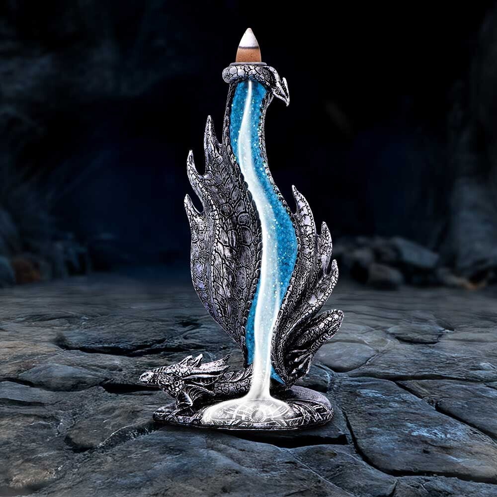 Hand-crafted dragon wing-shaped backflow incense burner with metallic silver finishFeatures vibrant blue crystalline channel for smoke flow effectCrafted from premium resin with detailed scale textures and weathered appearanceFunctional art piece designed for use with backflow incense cones
